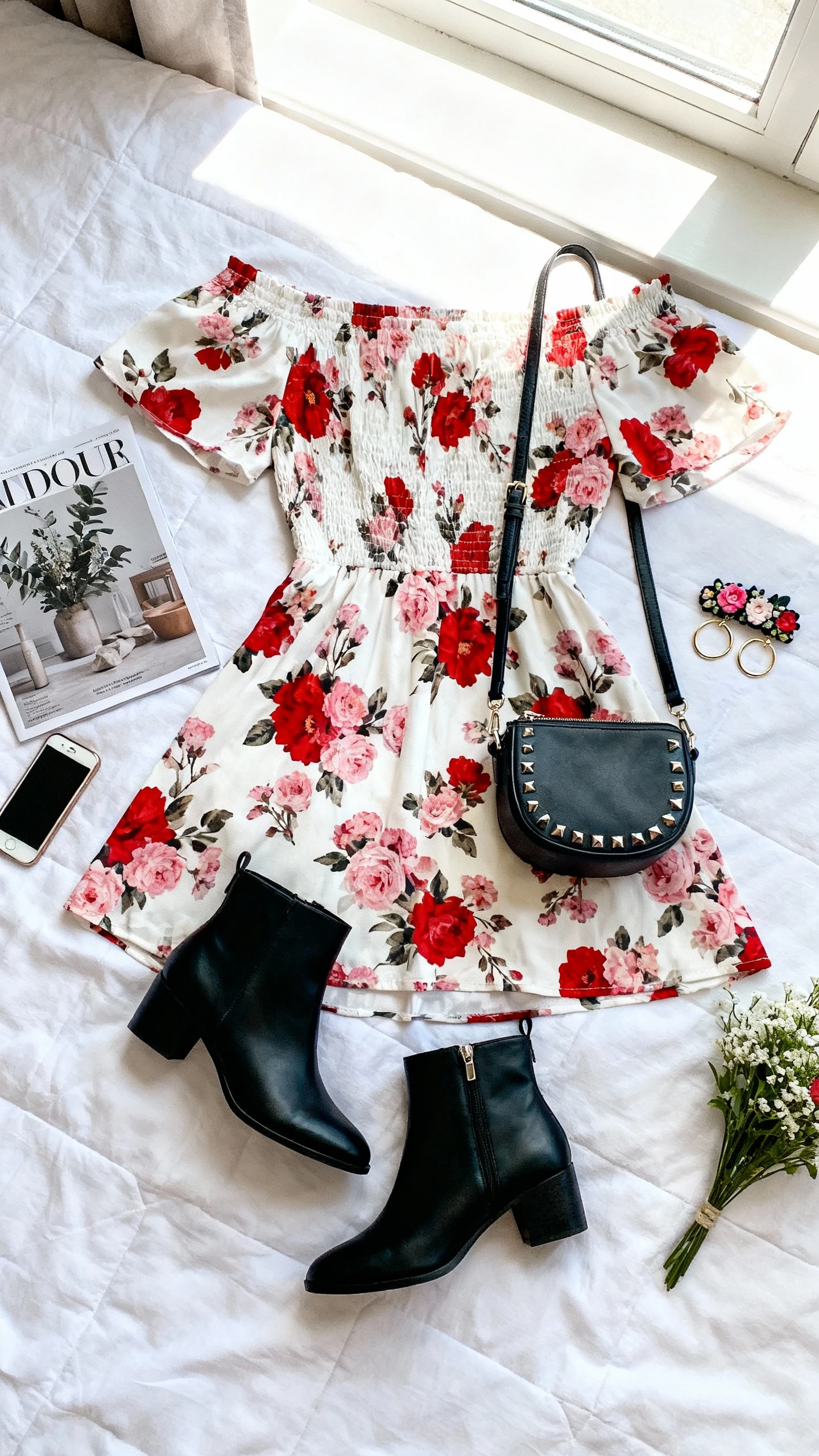 Florals for Valentine’s—groundbreaking when you do it right. Choose an off-shoulder silhouette with bold blooms in deep hues and pair it with boots to keep it cool, not cutesy. The shoulder detail highlights your collarbones and skin glow—instant romance.