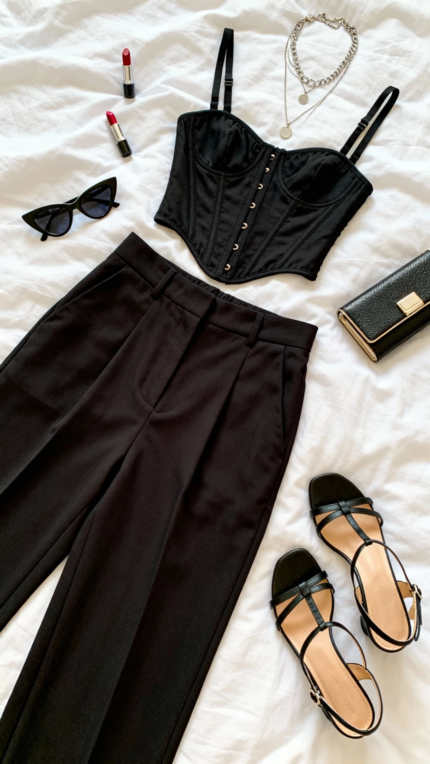 If you want something flirty but not overly sweet, this combo is your sweet spot. A sculpted corset and swishy trousers offer the best of both worlds: snatched up top, floaty at the bottom. It’s modern, playful, and so flattering.