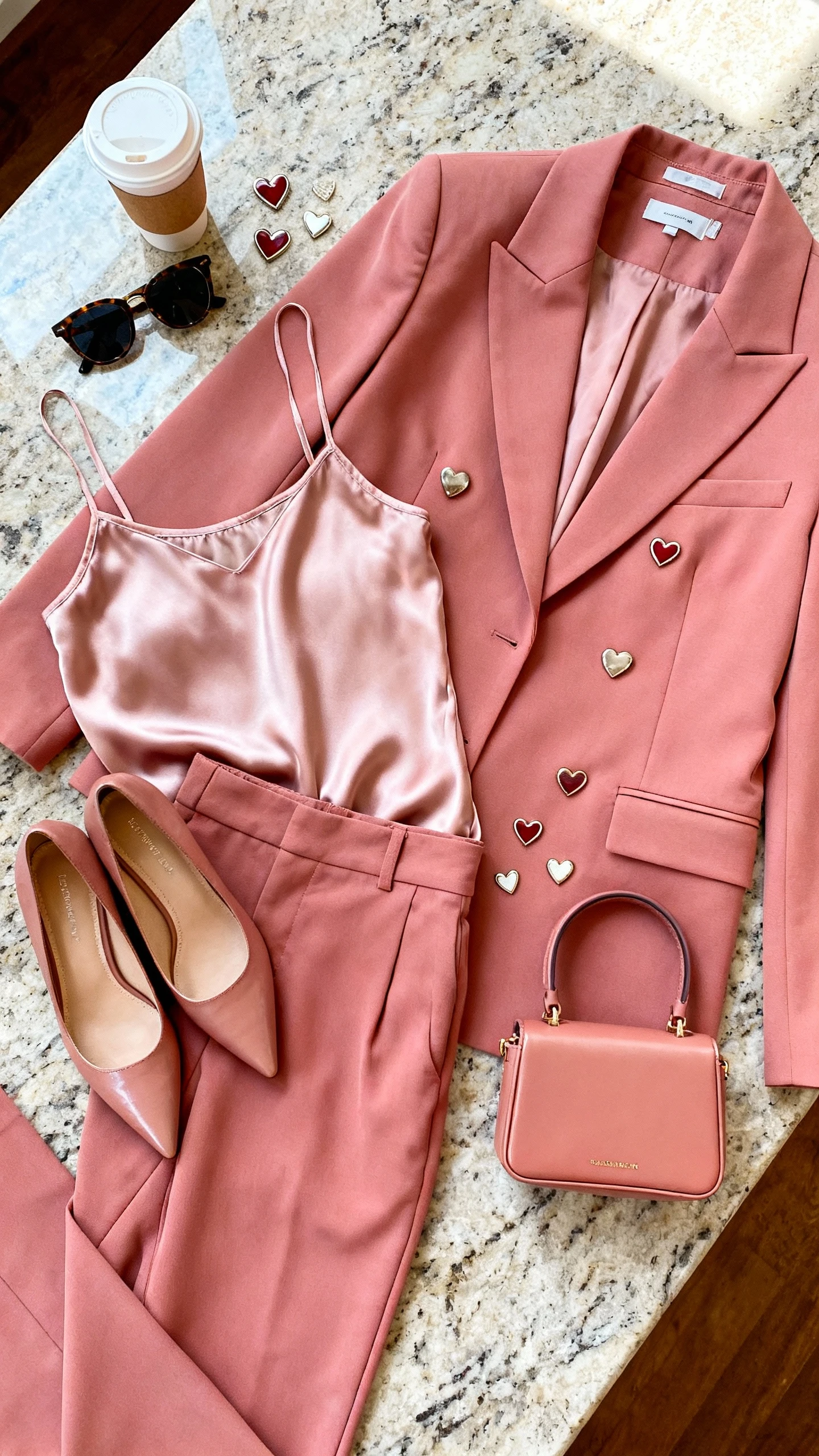 Who says romance can’t be tailored? A rose-toned suit feels polished, soft, and fresh—like a bouquet in outfit form. It’s unexpected for Valentine’s and looks incredible against melanin, especially when styled with warm metals and glossy accents.