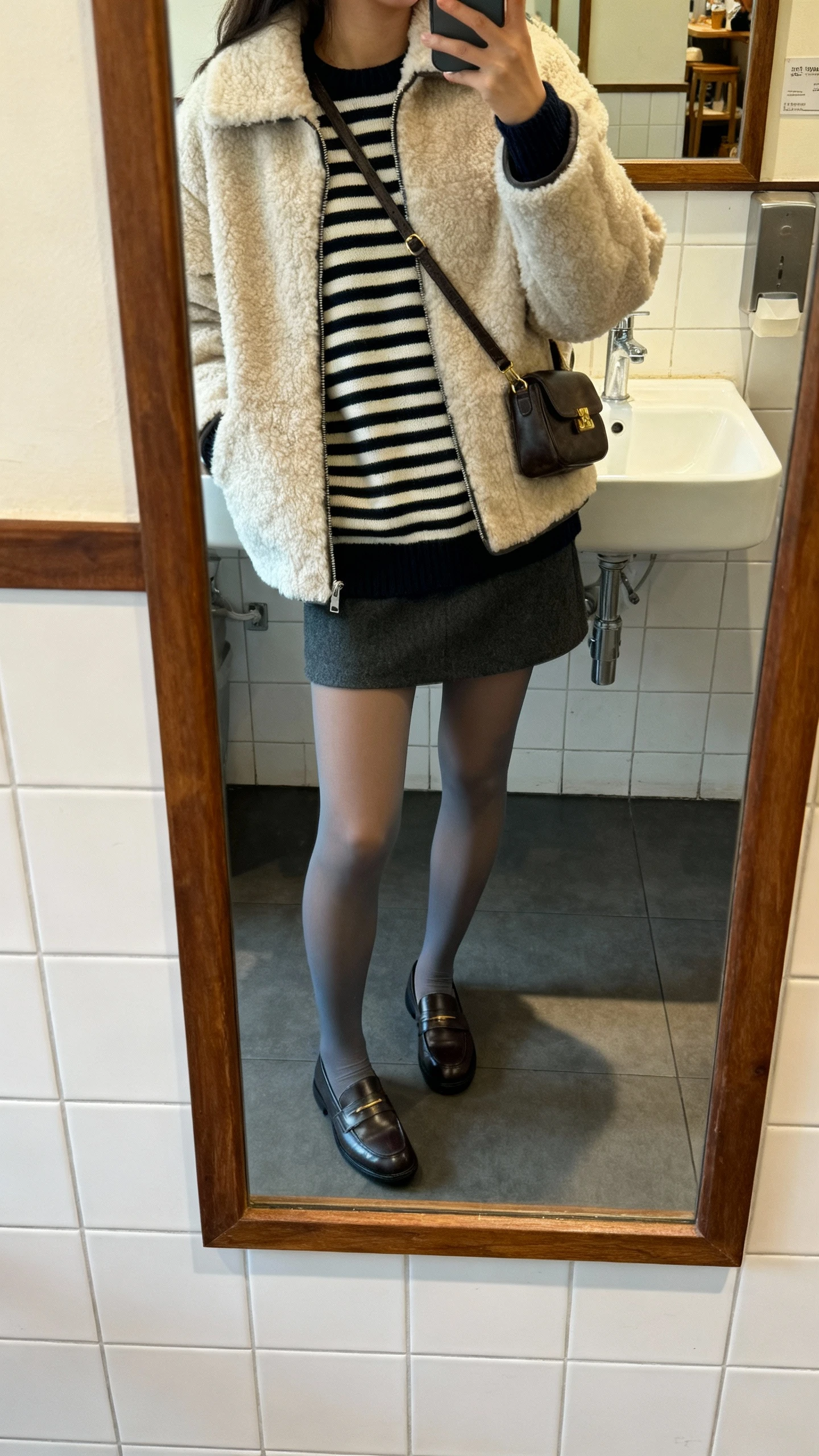 Consider this your cool-weather answer to the French-girl uniform. A shearling jacket over a mini skirt, striped knit, and tights delivers major charm while keeping you warm. It’s playful, chic, and surprisingly versatile.