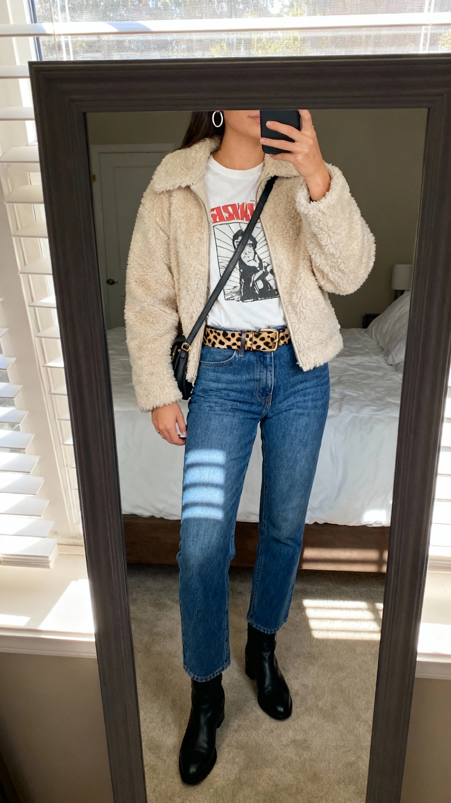 This one’s a classic for a reason. A shearling moto jacket paired with denim and ankle boots hits that perfect balance of polished and relaxed. It’s got just enough edge to feel intentional, but it’s not trying too hard. Great for brunch, gallery hopping, or a casual date night.