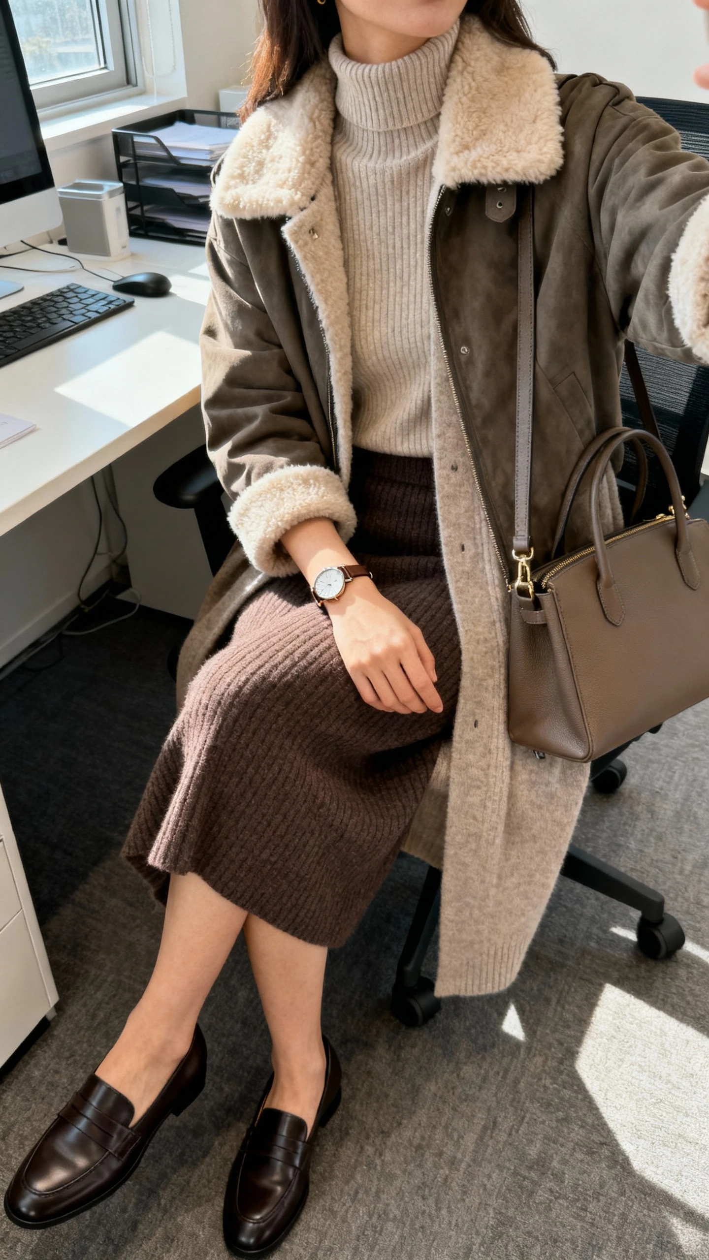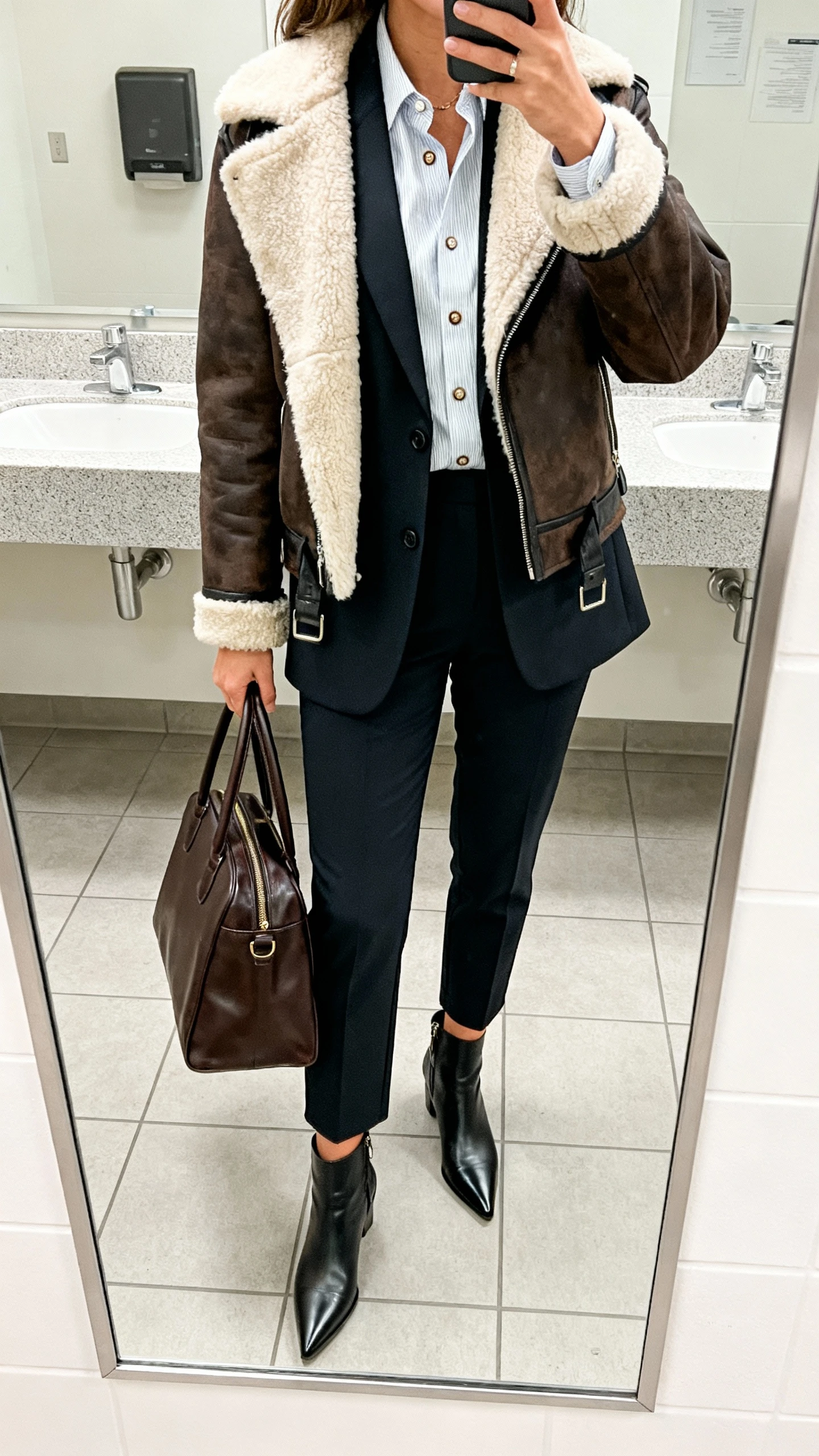 Who says cozy can’t be corporate? A shearling-collar jacket over refined knits and tailored bottoms gives you that understated luxury feel. Warm, polished, and totally appropriate for meetings, presentations, and power lunches.