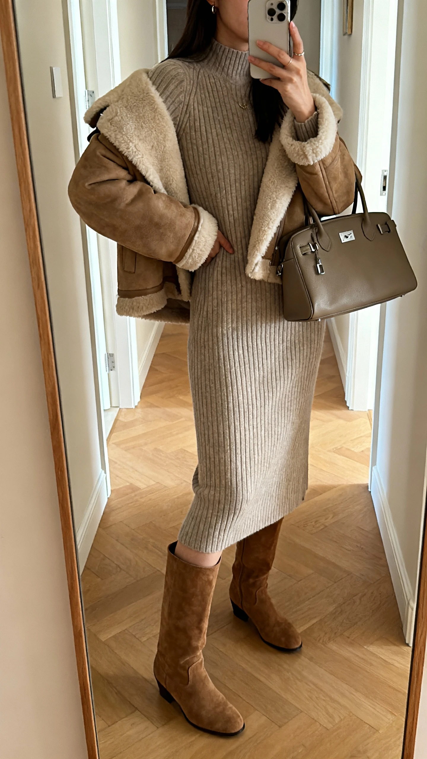 Want to look put-together in five minutes? Throw on a ribbed knit dress, tall boots, and a plush shearling. It’s softly structured and incredibly comfortable—like a hug you can wear. This combo nails daytime polish and date-night romance.