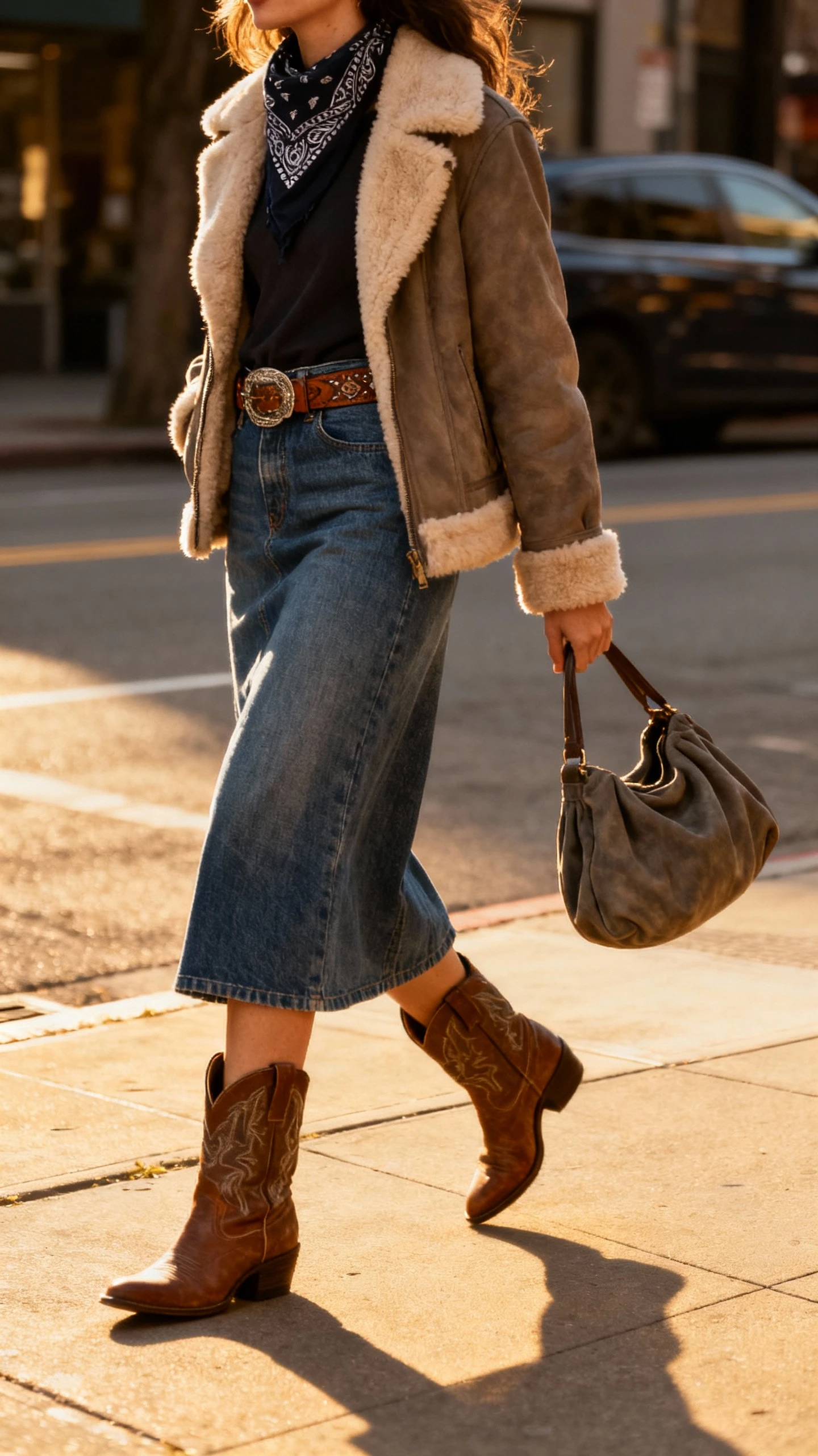 Channel a little Western flair without going full rodeo. A shearling-lined jacket over a denim skirt with Western-inspired boots gives you that throwback-meets-modern feel. Easy, flattering, and made for farmers’ markets and outdoor meetups.