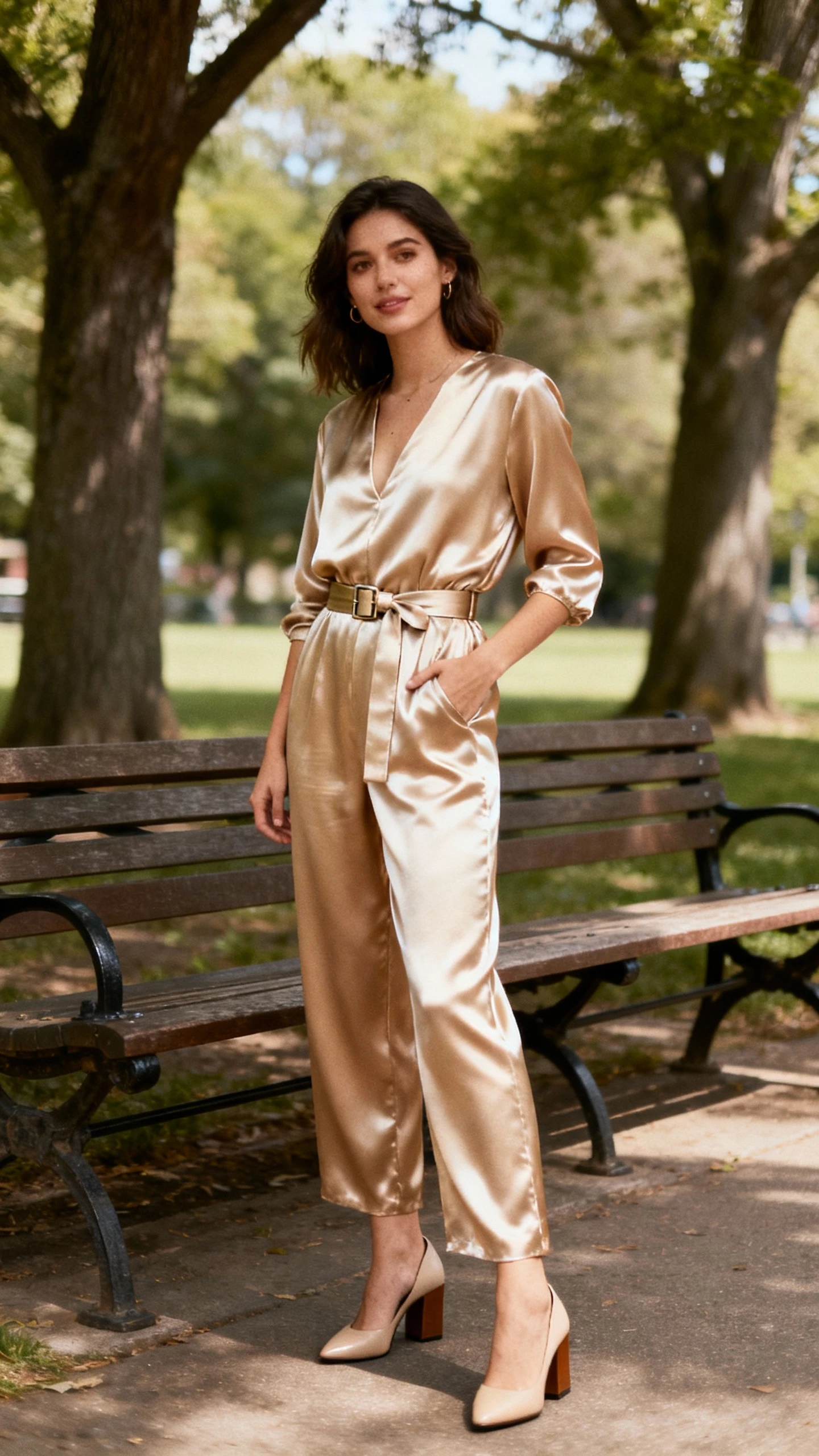 - Satin or crepe jumpsuit in champagne or warm beige