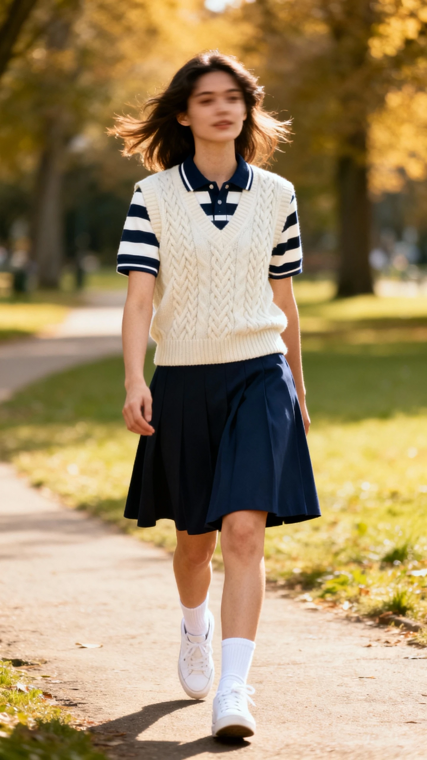 Channel vintage club charm without looking costume-y. A striped knit and sweater-vest combo brings personality, while a swingy skirt keeps it modern and flattering. It’s cheerful, classic, and very spring.