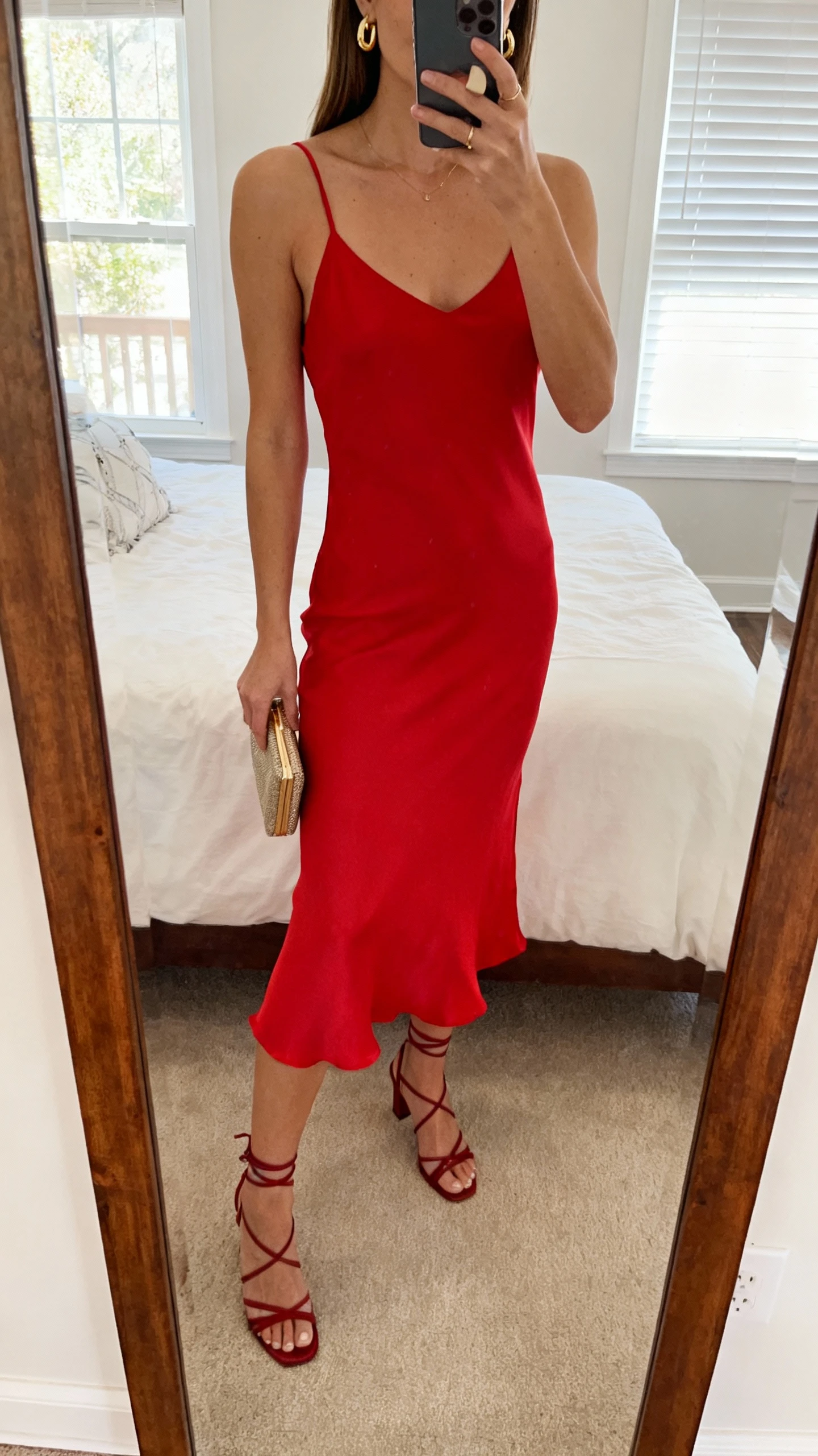 Red is the universal “I’m feeling myself” color, and a slip dress in satin or silk makes it effortless. This look is sleek, minimal, and timeless—perfect for dinner reservations, a show, or anywhere you want that soft-glow glamour. Bonus: it layers beautifully if you’re somewhere chilly.