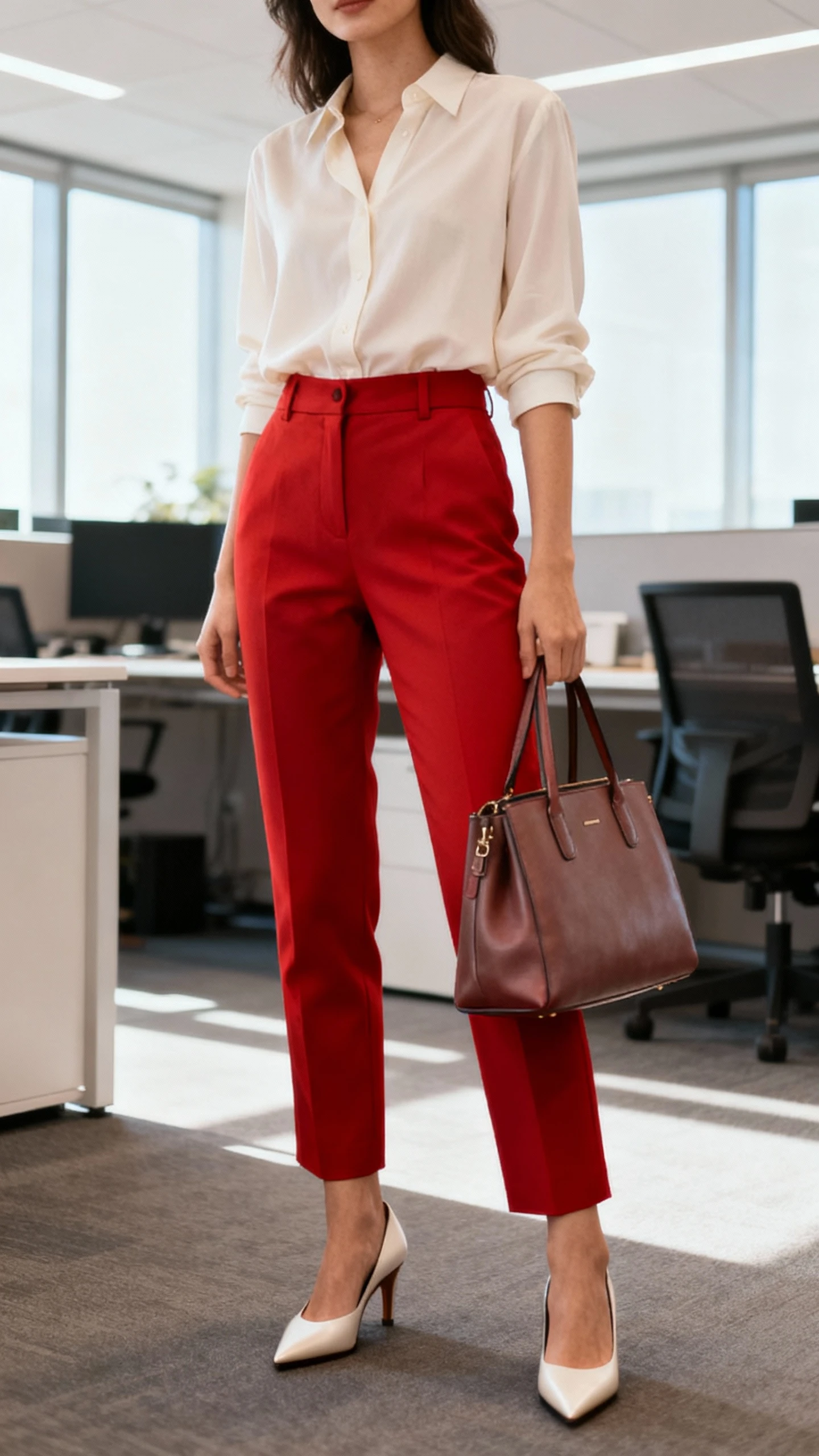 4. The Red Tailored Trousers + Soft Blouse Combo That Means Business (And Pleasure)