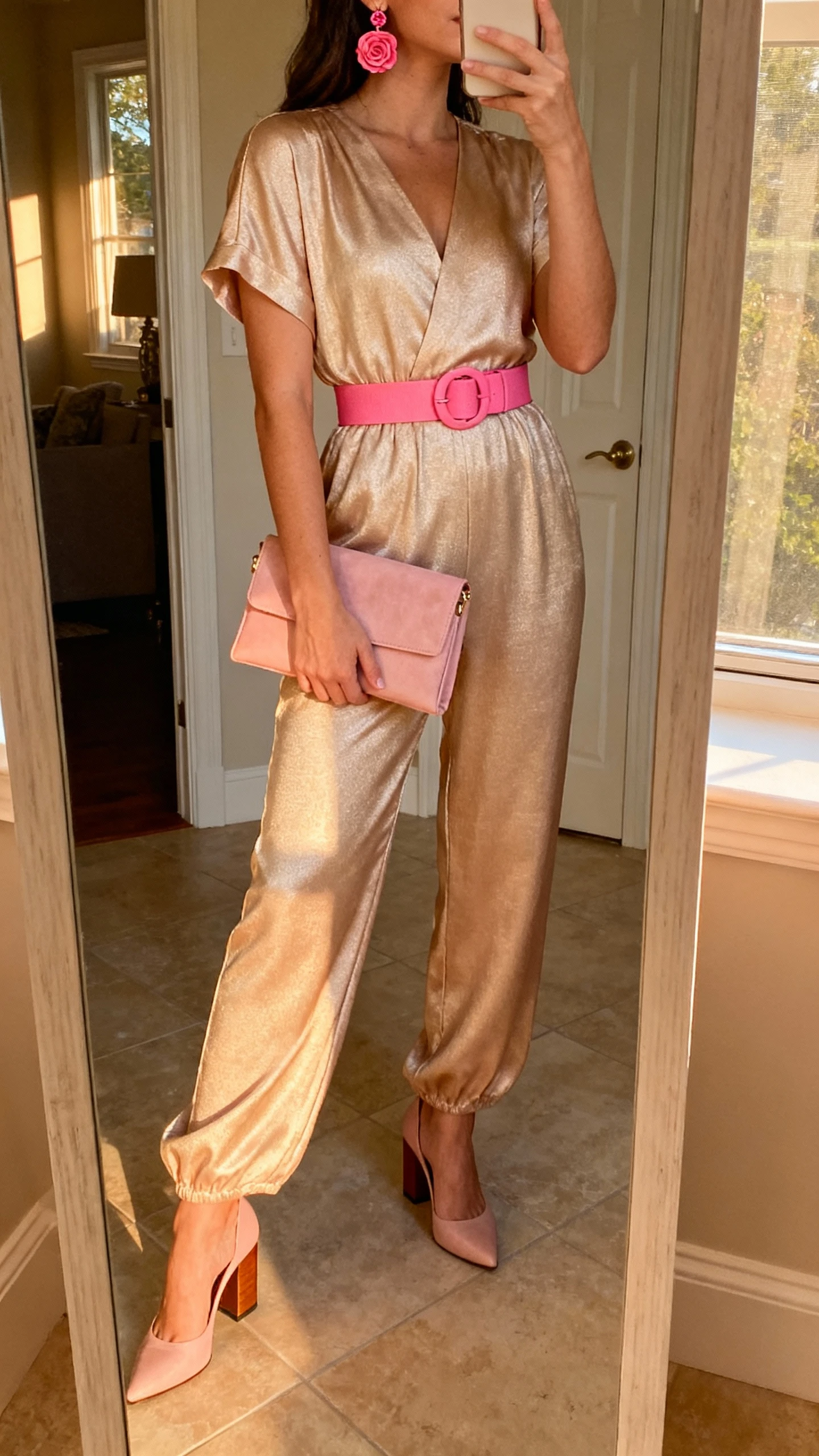 9. The Champagne Jumpsuit Glow-Up With Rose Accessories