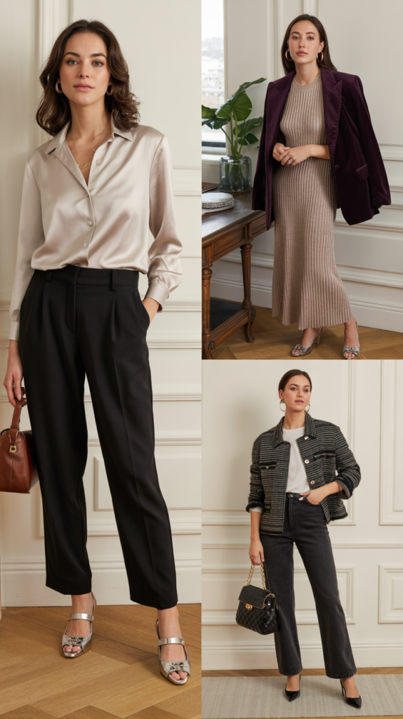 - Cool-Girl Classic: Tweed jacket + dark jeans (if your office allows) + pointed flats.
