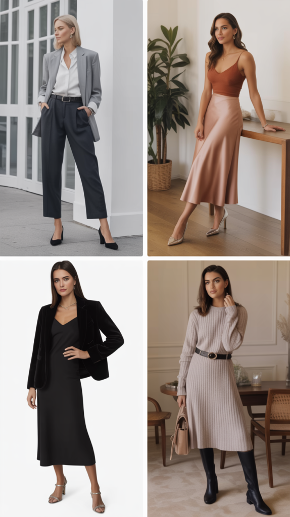 - Sweater + Fancy Bottom: Ribbed knit with a metallic midi or tailored trousers in a bold color? Chef’s kiss.