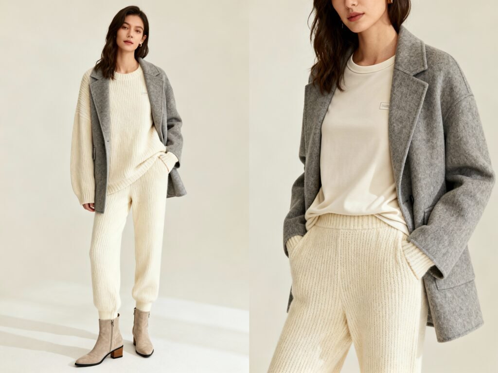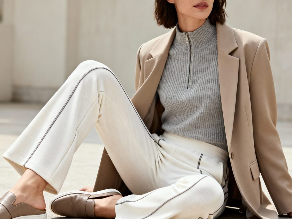 We’re not talking gym leggings and a hoodie. We’re talking tailored joggers, a cashmere or merino sweater, and a sleek zip-up or blazer. Throw a chain necklace over the knit and suddenly you’re “off-duty executive.” How to style it: