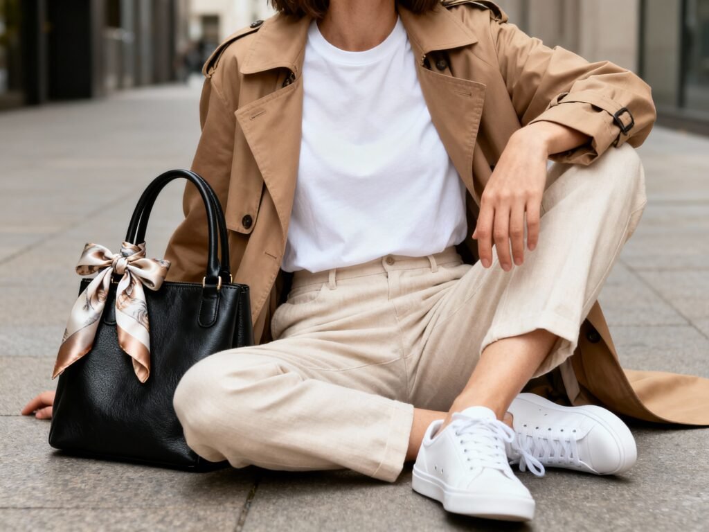 - Shoes: clean court sneakers; switch to square-toe flats