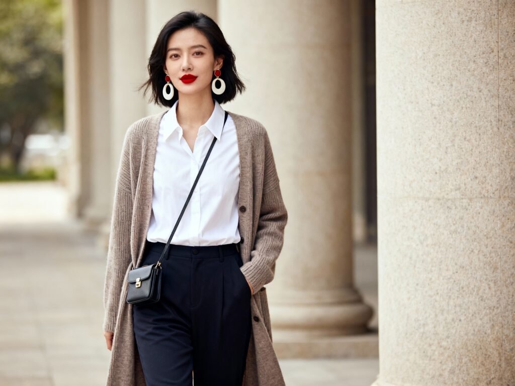 A crisp-yet-soft oversized button-down turns travel basics into “I planned this.” Wear it half-tucked into straight jeans or tailored trousers. Roll the sleeves, add lipstick, done. How to style it: