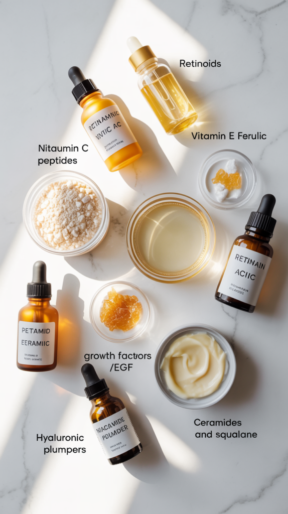- Peptides: Signal skin to firm up. Not magic on their own, but great team players with retinoids or vitamin C.