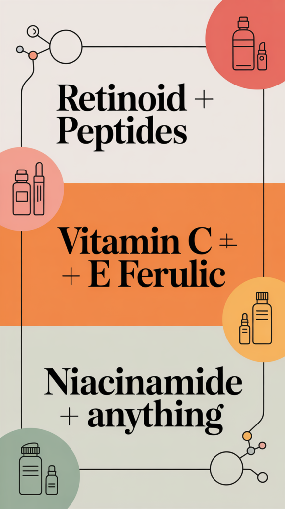 - Retinoid + Peptides at night: Smoother, firmer, less irritation.