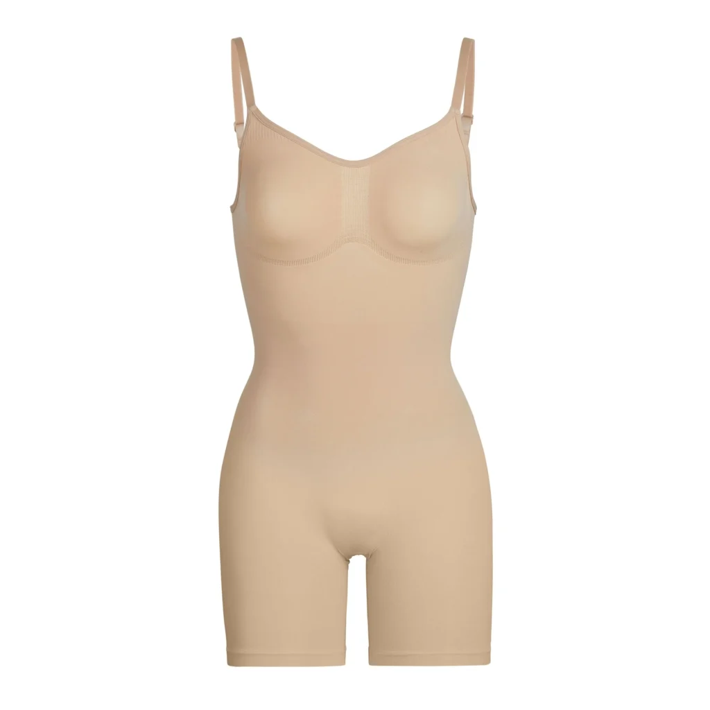 - Sculpting Bodysuit Mid Thigh: Full-body smoothing with leg coverage that eliminates the dreaded butt-cheek line. Works under bodycon dresses and slip skirts.