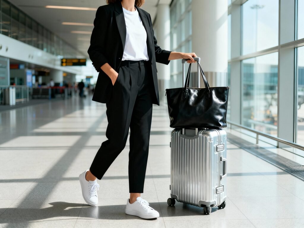 - Airport Look: White tee + trousers + sneakers + blazer = effortless & comfy