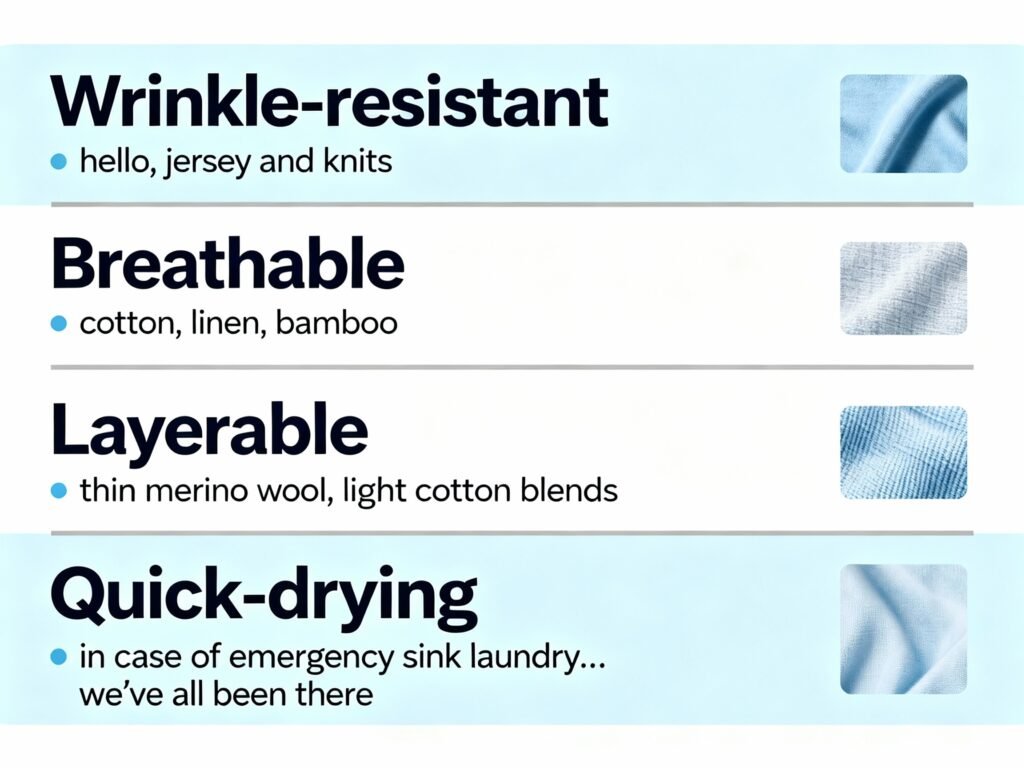 Stick to fabrics that roll well (not fold) to maximize suitcase space and minimize wrinkles.