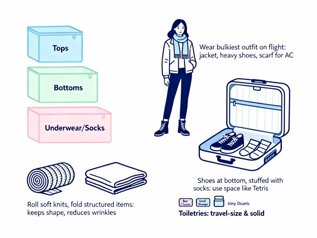 - Toiletries go travel-size and solid: bar cleanser, solid shampoo, tiny decants. Airport security will thank you.
