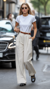 Model-Off-Duty Polished: White tee + high-waist wide-leg trousers + leather belt + loafers + tiny crossbody.