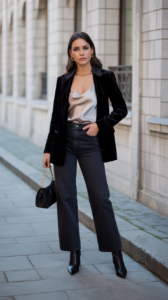 Low-Key Rock Chic: Black jeans + silk cami + velvet blazer + pointed boots. Add a smoky eye if you want drama.
