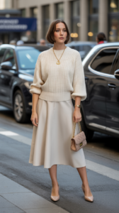 Chrome Hour: Monochrome cream knit top + cream midi skirt + nude pumps + gold chain. Choose slightly different textures for depth.