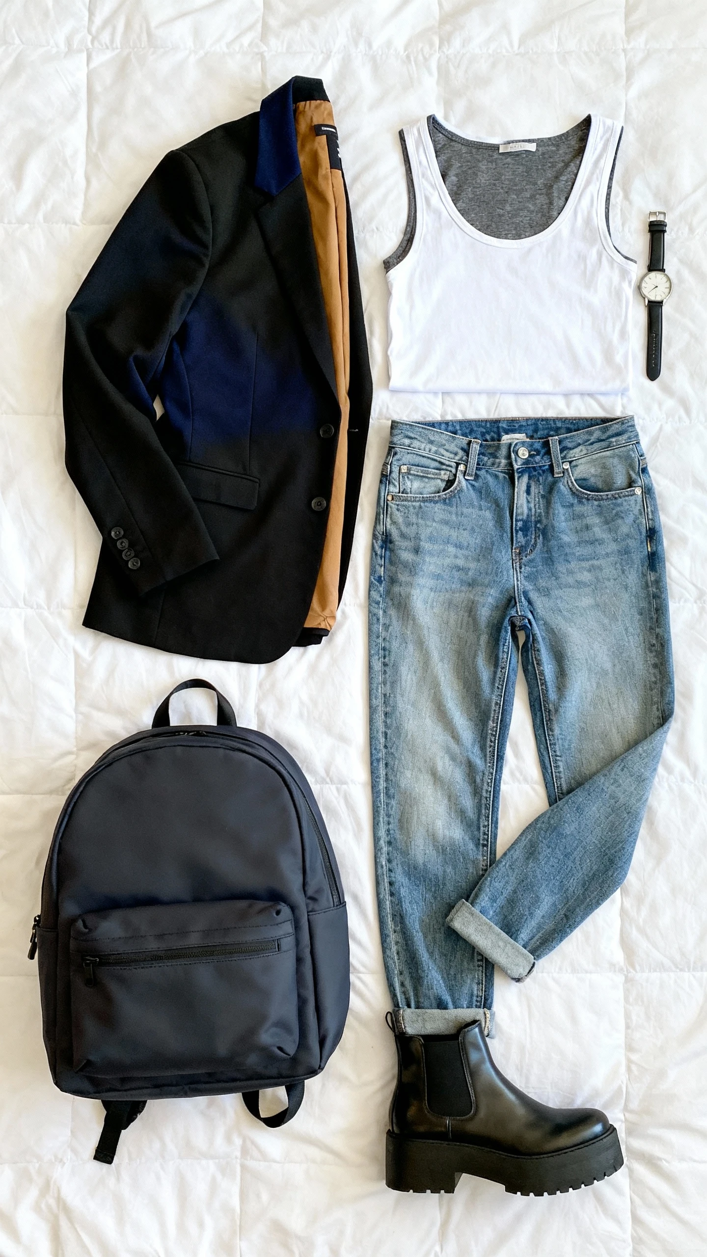 Perfect if you’re landing and heading straight to brunch, a casual meeting, or sightseeing. Want more texture? Try a tweed-look blazer with a plain tee and washed denim. If you’re checking bags, slip a silk scarf in your blazer pocket—tiny detail, big upgrade.