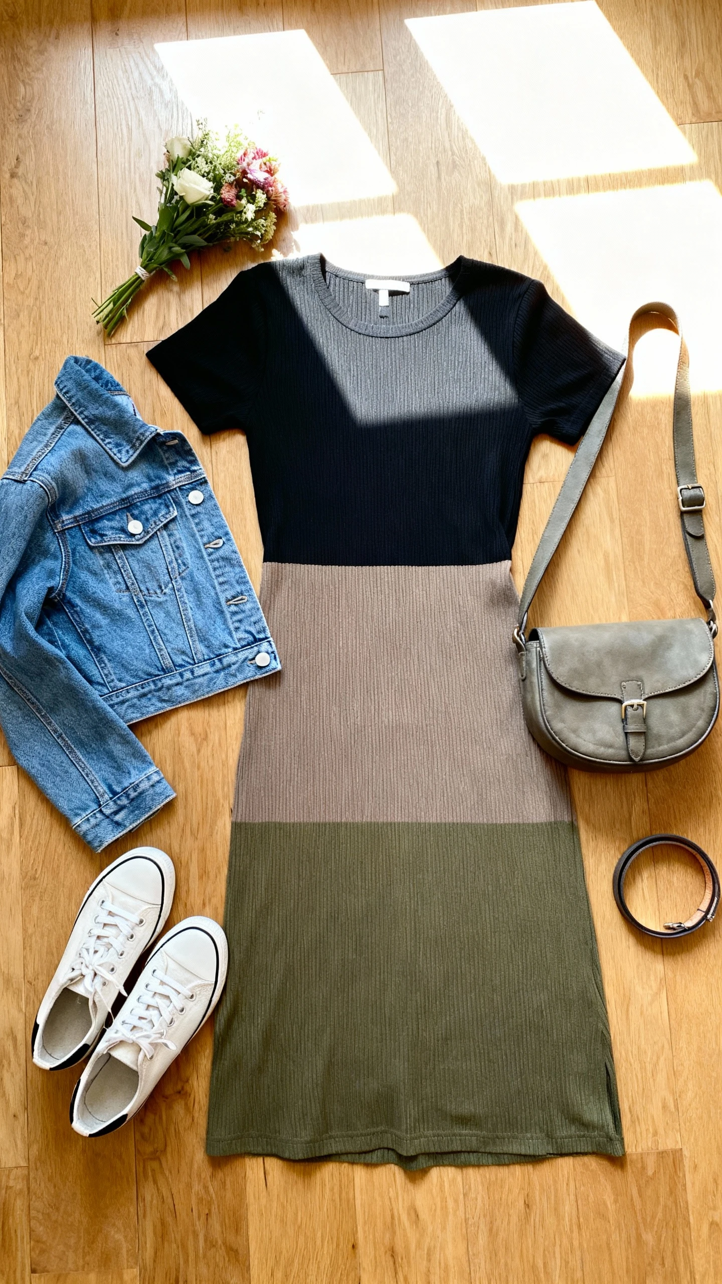 - Soft midi dress (ribbed knit, jersey, or t-shirt dress) in black, olive, or taupe