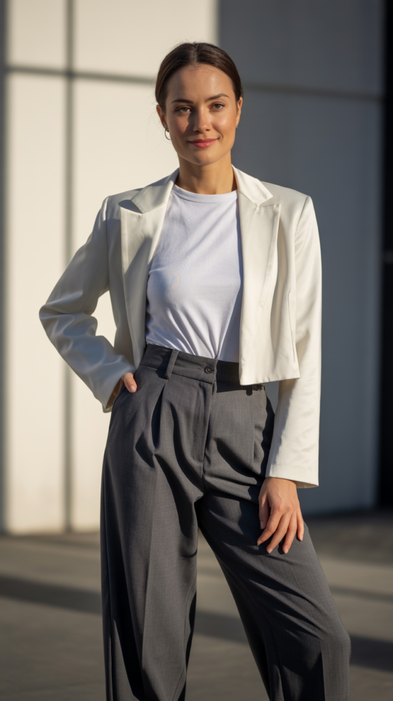 Try this: high-rise pants + tucked tee + cropped jacket. That gives you 1/3 on top and 2/3 on the bottom—instant length.