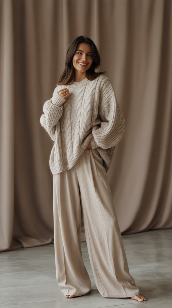 - Balance volume. If you go big on top (slouchy sweater), go sleek on bottom (straight or slim pants).