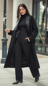 Fine-knit turtleneck + wool trousers + pointed boots + long coat.
