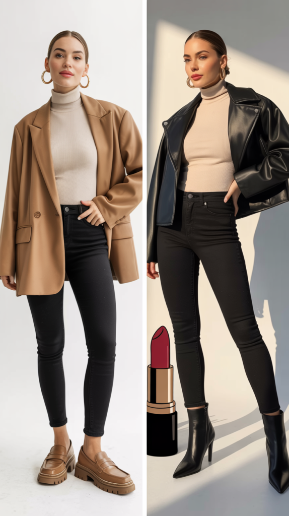 Day: Black jeans, ribbed turtleneck, chunky loafers, blazer. Night: Swap loafers for heeled ankle boots, add bold earrings, slick on red lipstick, ditch the blazer for a leather jacket.