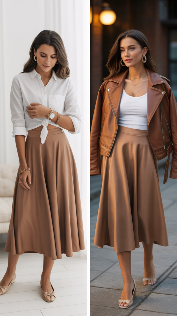Day: Half-tucked shirt, simple jewelry, ballet flats. Night: Tie the shirt at the waist or swap for a tank, throw on a blazer or moto jacket, add hoops. FYI, a satin midi is basically a Swiss Army knife in your closet.