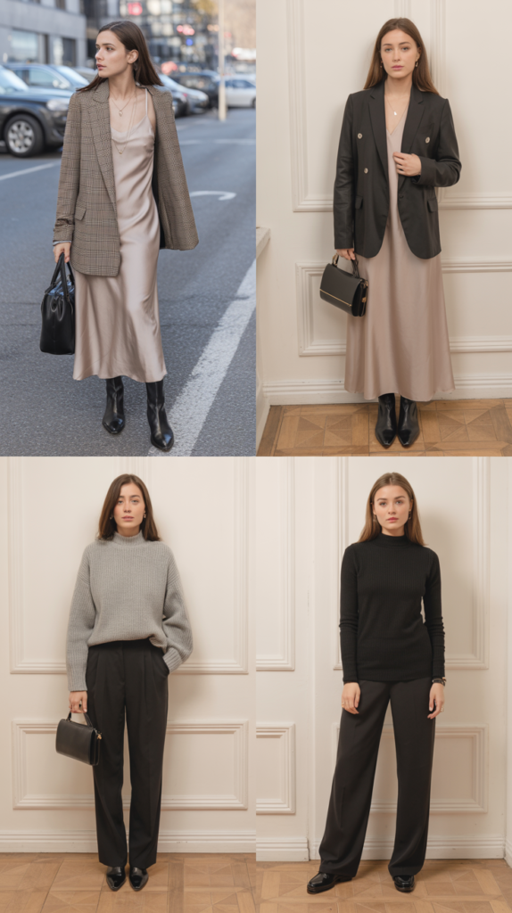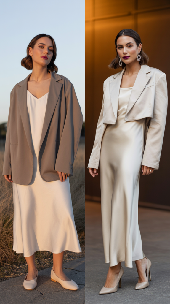 Day: Slip dress + oversized blazer + flats or loafers. Night: Lose the blazer or swap for a cropped jacket, add heels or pointed boots, statement earrings, and lipstick. Why it works: Minimal effort, maximum chic.