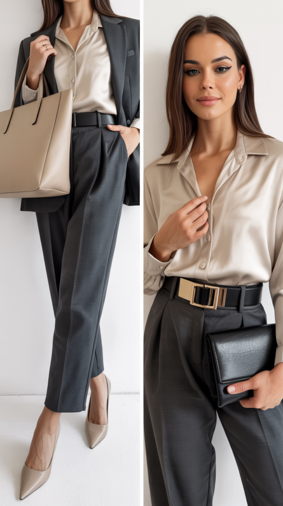 Day: Tailored trousers, silk blouse, pumps, structured tote. Night: Unbutton one more button (within reason), add a statement belt, switch to a mini bag, smoky liner. Result: Polished but not boringsville.