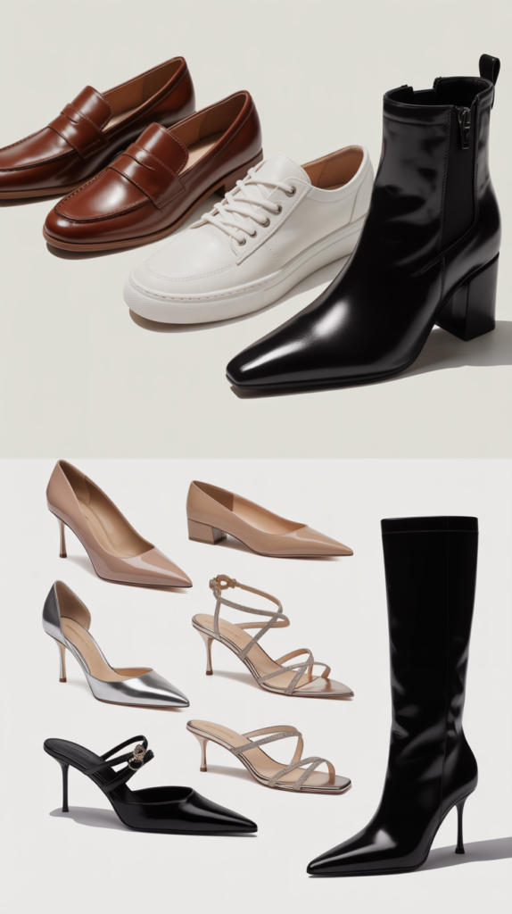 - Night: Pointed-toe pumps, kitten heels, slingbacks, or high-ankle boots.