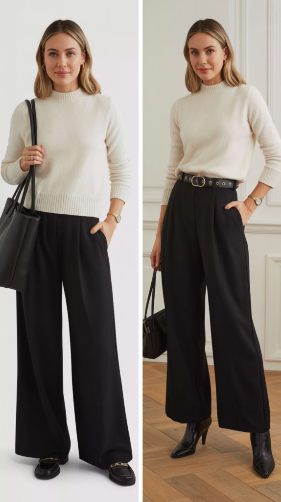 - Trousers + fitted knit: Structured enough for the office, sleek enough for cocktails.