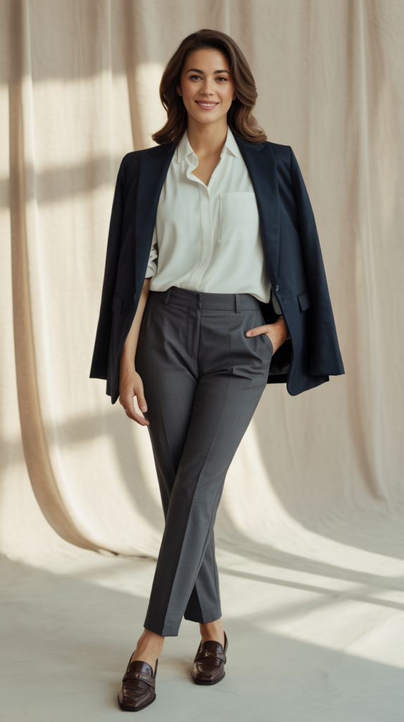 Think timeless: white button-down, black trousers, loafers, blazer. Easy, clean, and you can’t mess it up.