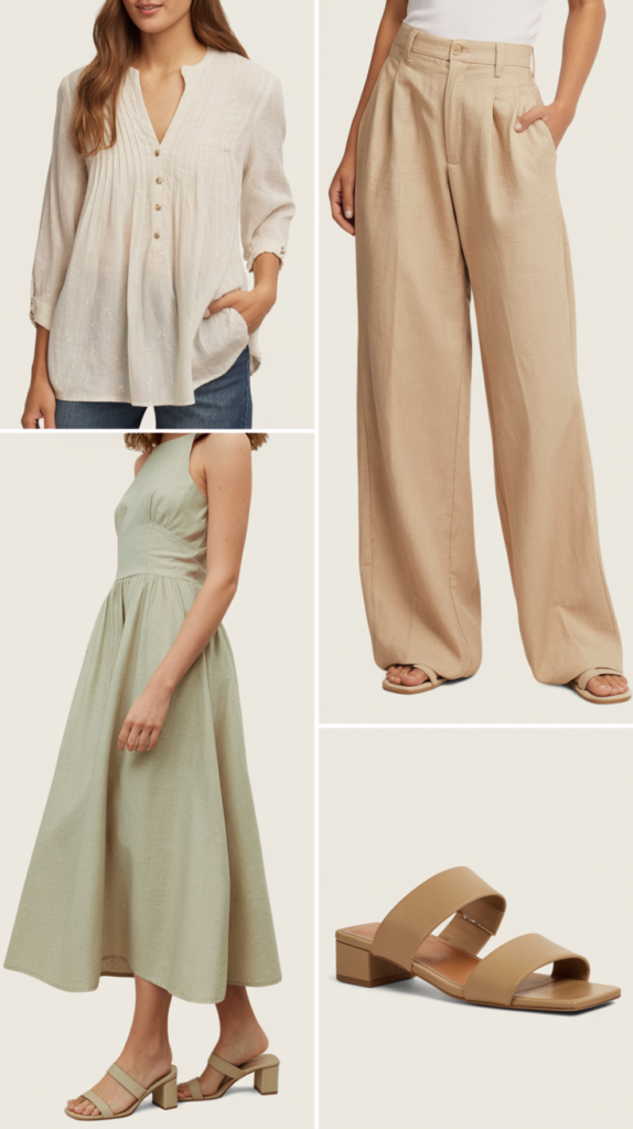 - Shoes: Loafers, flats, ankle boots, or low heels