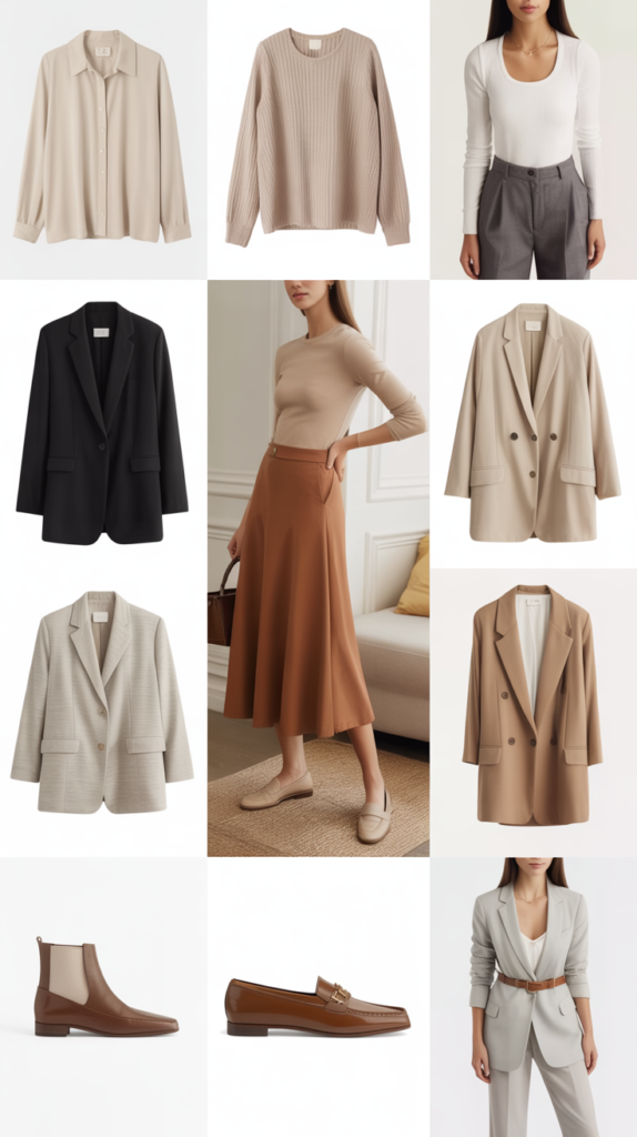 Start with basics (like trousers, blouses, and loafers), layer on extras (blazers, accessories), and tweak for the season. Before you know it, you’ll have a closet full of easy outfits that make you look confident without trying too hard.