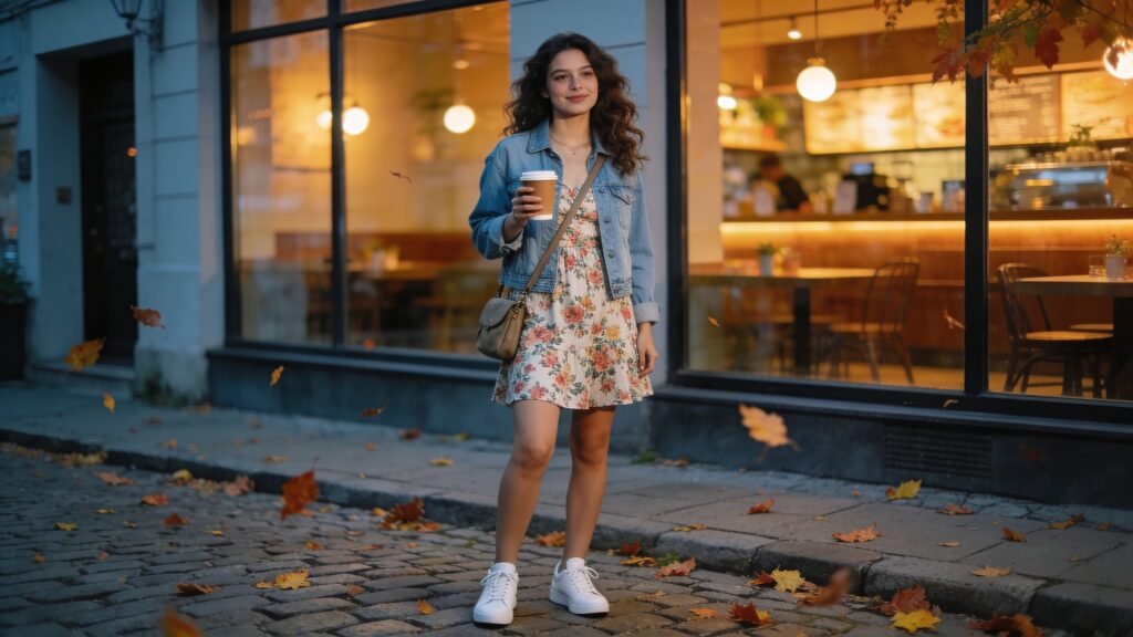 - Cool evening: Tee under sundress + denim jacket + sneakers. Cute and warm.