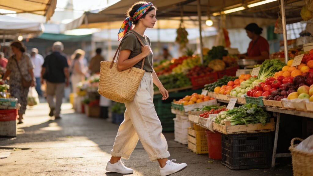 - Market morning: Tee + linen pants + sneakers + straw tote + scarf-as-headband.