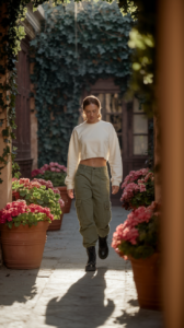 | Busy Errands | Cropped sweater + cargo pants + sneakers |