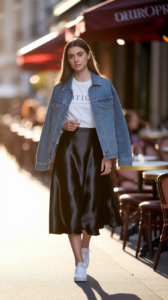 4. Midi Skirt + Graphic Tee + Denim Jacket