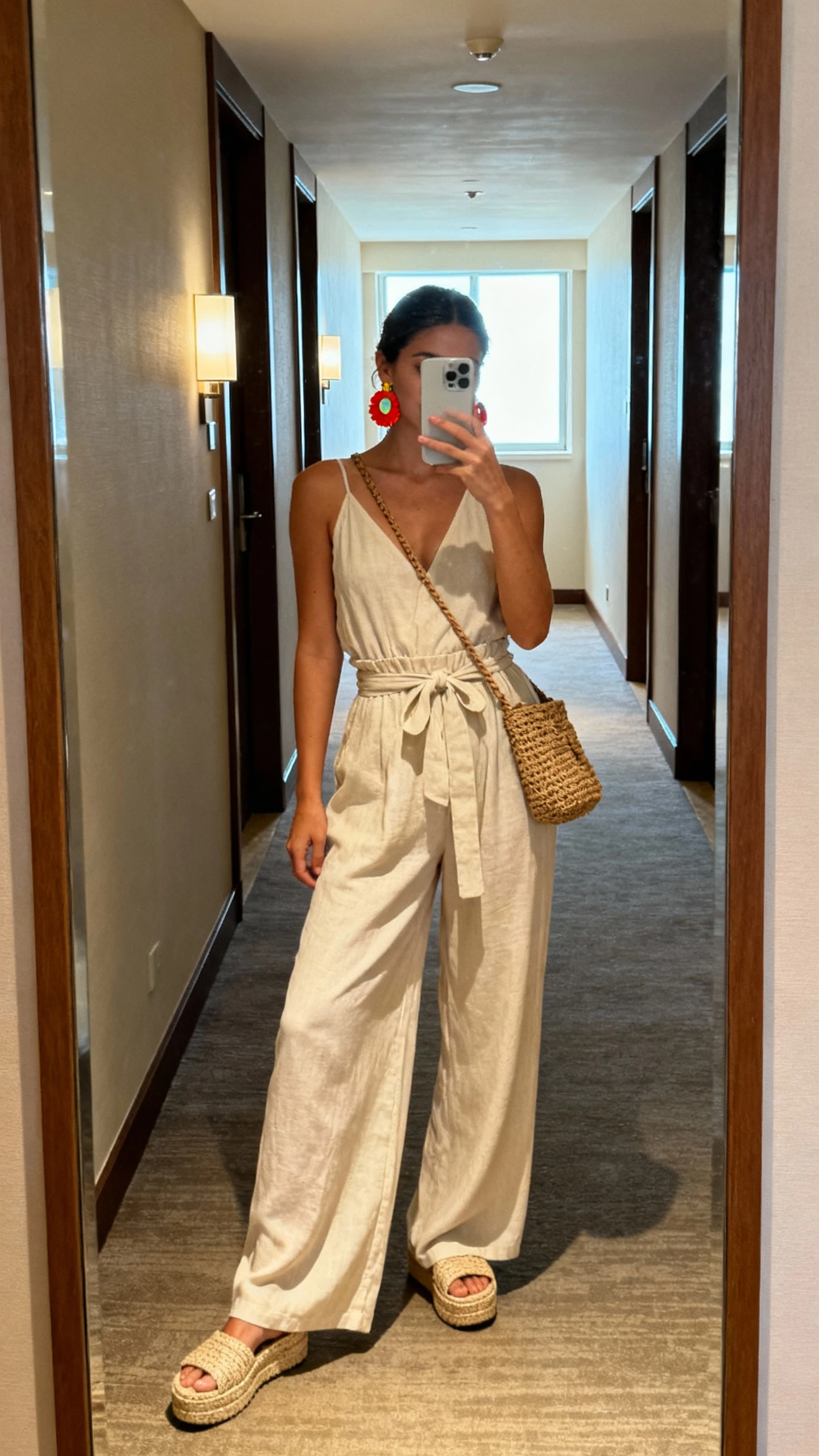 - Wide-leg jumpsuit (linen blend or silky weave, adjustable straps)