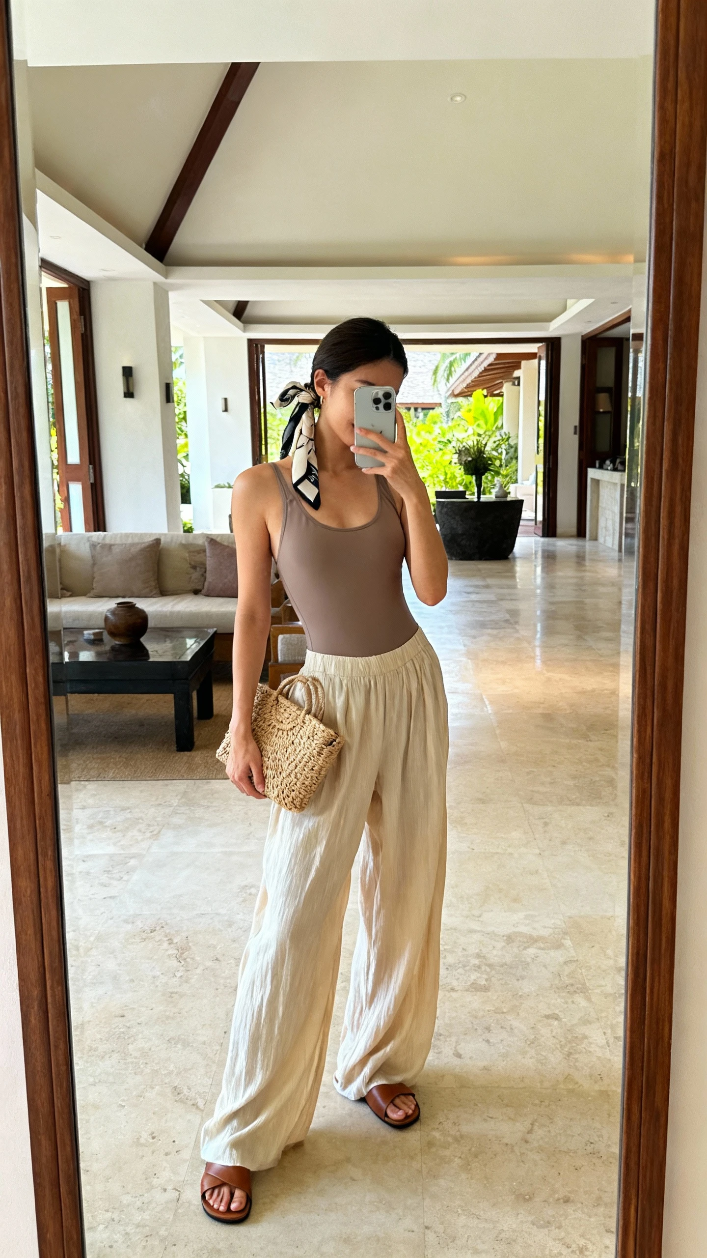 This outfit is pure resort chic. A sleek one-piece swimsuit turns into a bodysuit when tucked into flowing pants—suddenly you’re ready for cocktails, not just cabanas. It’s smooth, flattering, and wildly versatile.