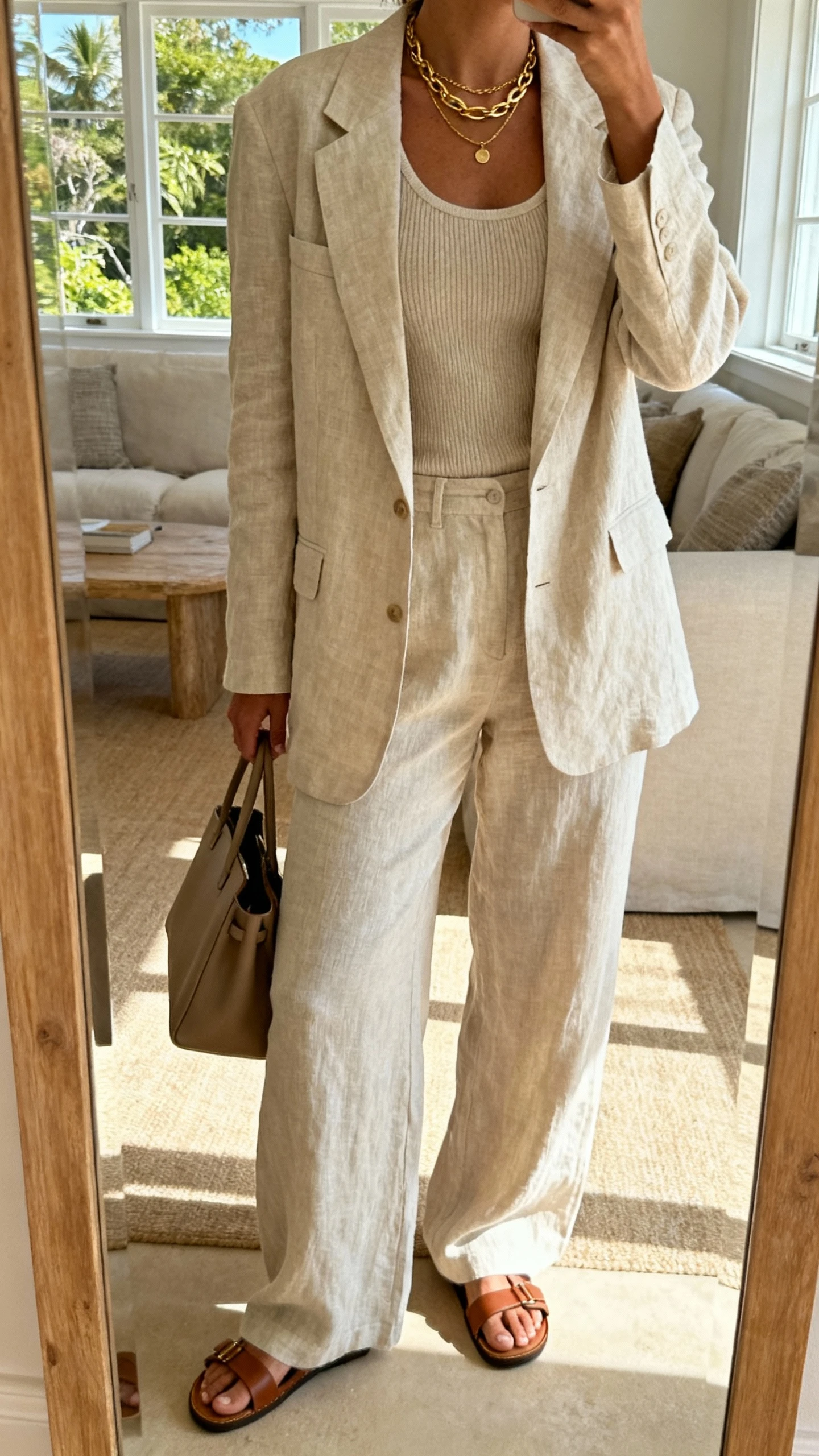 - Outer layers: linen shirt, light cardigan, cropped windbreaker.