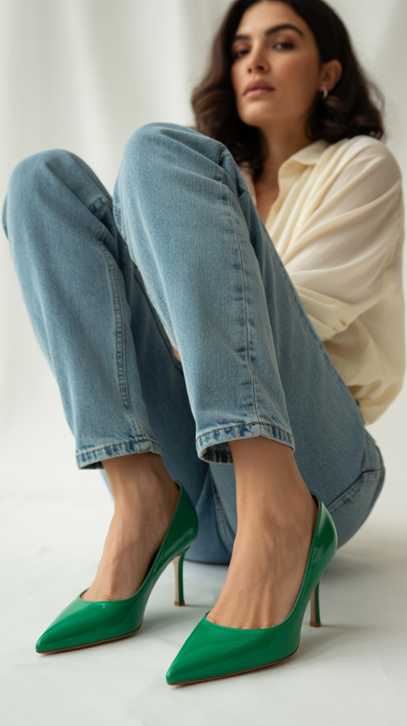 - Neutral + Pop: Neutral jeans and top, bold-colored heels (think cobalt, fuchsia, or emerald).