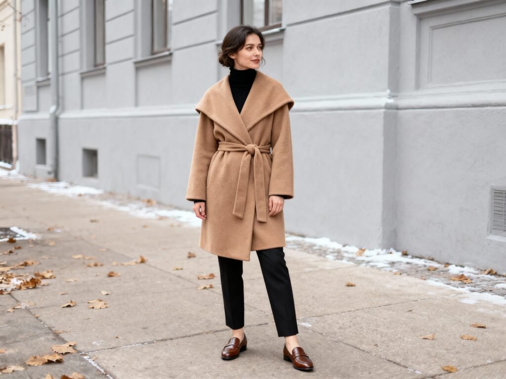 - Camel wrap coat: Sophisticated, seasonless, and always photogenic.